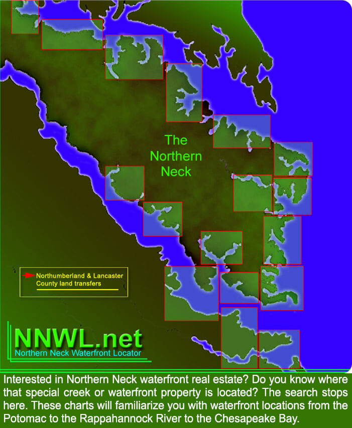 Maps of creeks and rivers, their relative location in the Northern Neck peninsula, information resources, land transfers listings for Northumberland County and Lancaster County are provided with just a click of the mouse and I will continue to add new resources and updated features as they become available.